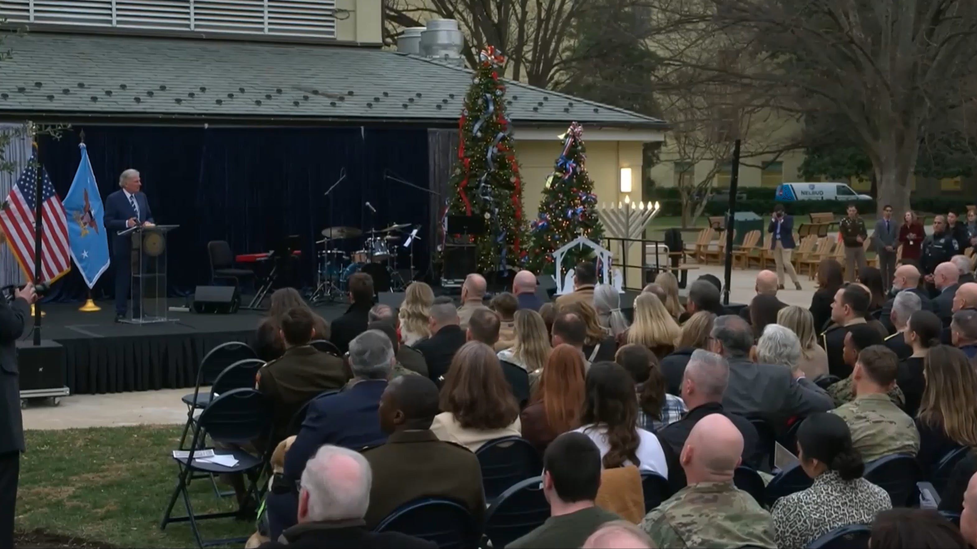 During the Pentagon’s service, West led the crowd in singing “Joy to the World,” “O Come Let Us Adore Him,” and his own song “Don’t Stop Praying.” Introducing the latter one, he said, “We will not stop praying for you and for our great country, the United States of America.” Wilson sang “O Holy Night” and three of her own songs, “I Still Believe in Christmas,” “Just Because It’s Christmas,” and “My Jesus.”