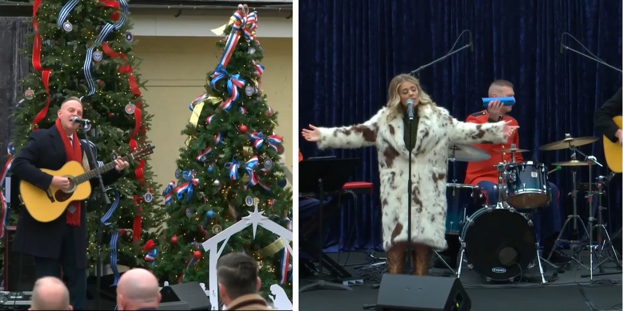 Christian musicians Matthew West and Anne Wilson performed during the service, making it the first of the monthly events with invited musicians instead of just congregational singing led by the preacher or a chaplain. Earlier this month, West sang at the CBS News town hall conversation between Bari Weiss and Erika Kirk, and he served as a co-host for the White House Christmas tree lighting. And he left the Pentagon service early to perform in a Christmas special at the Trump-controlled Kennedy Center. Wilson last year released a song in response to the assassination attempt on Trump to encourage Christians to “stand your ground, say, ‘I won’t back down.’”