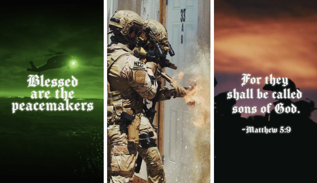 Another administration figure invoking the verse is Pete Hegseth. Instead of going by Secretary of Defense, he likes to call himself Secretary of War, which is even more obviously nonpeaceful. Yet, in August, he posted photos of himself with uniformed soldiers and the caption, “Blessed are the Peacemakers. May God bless our troops, and our President.”