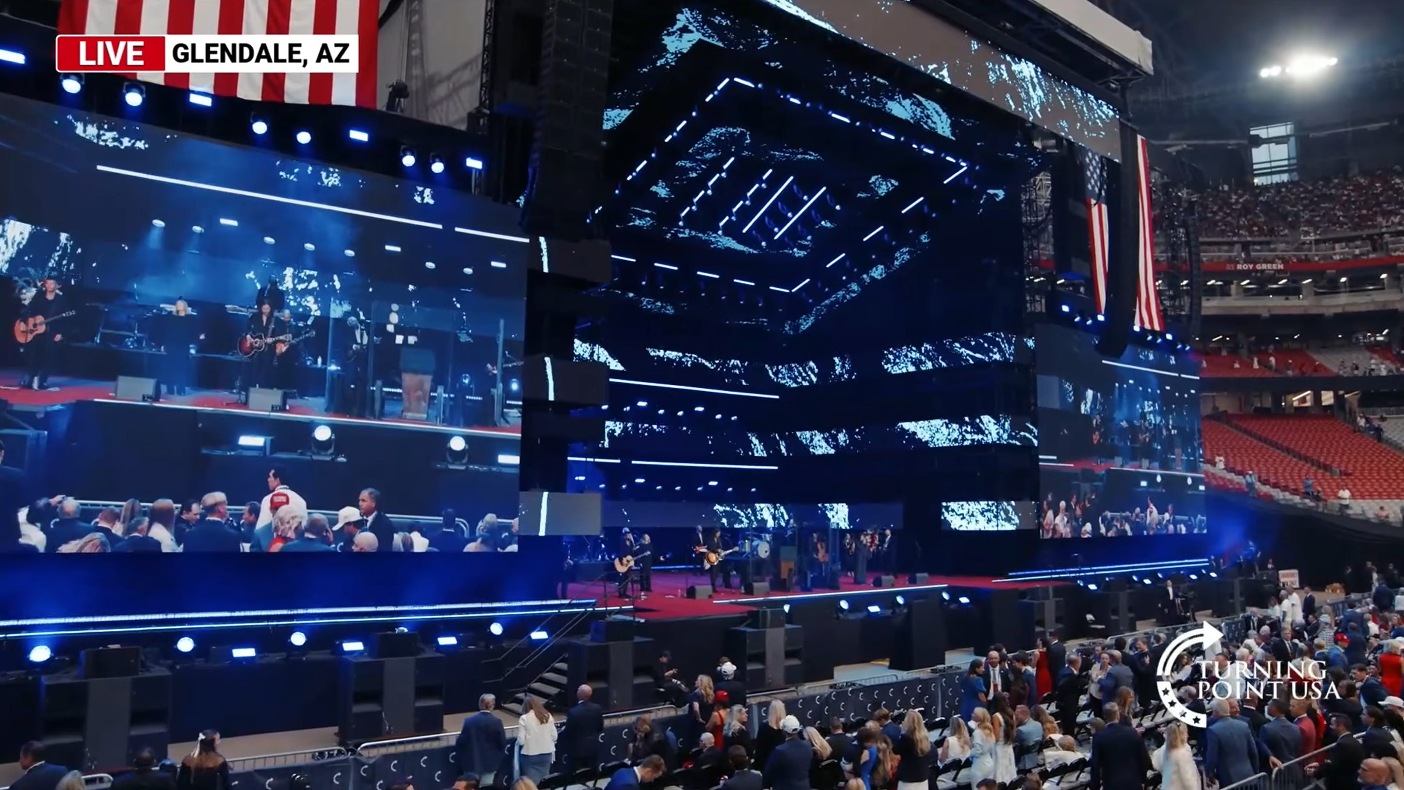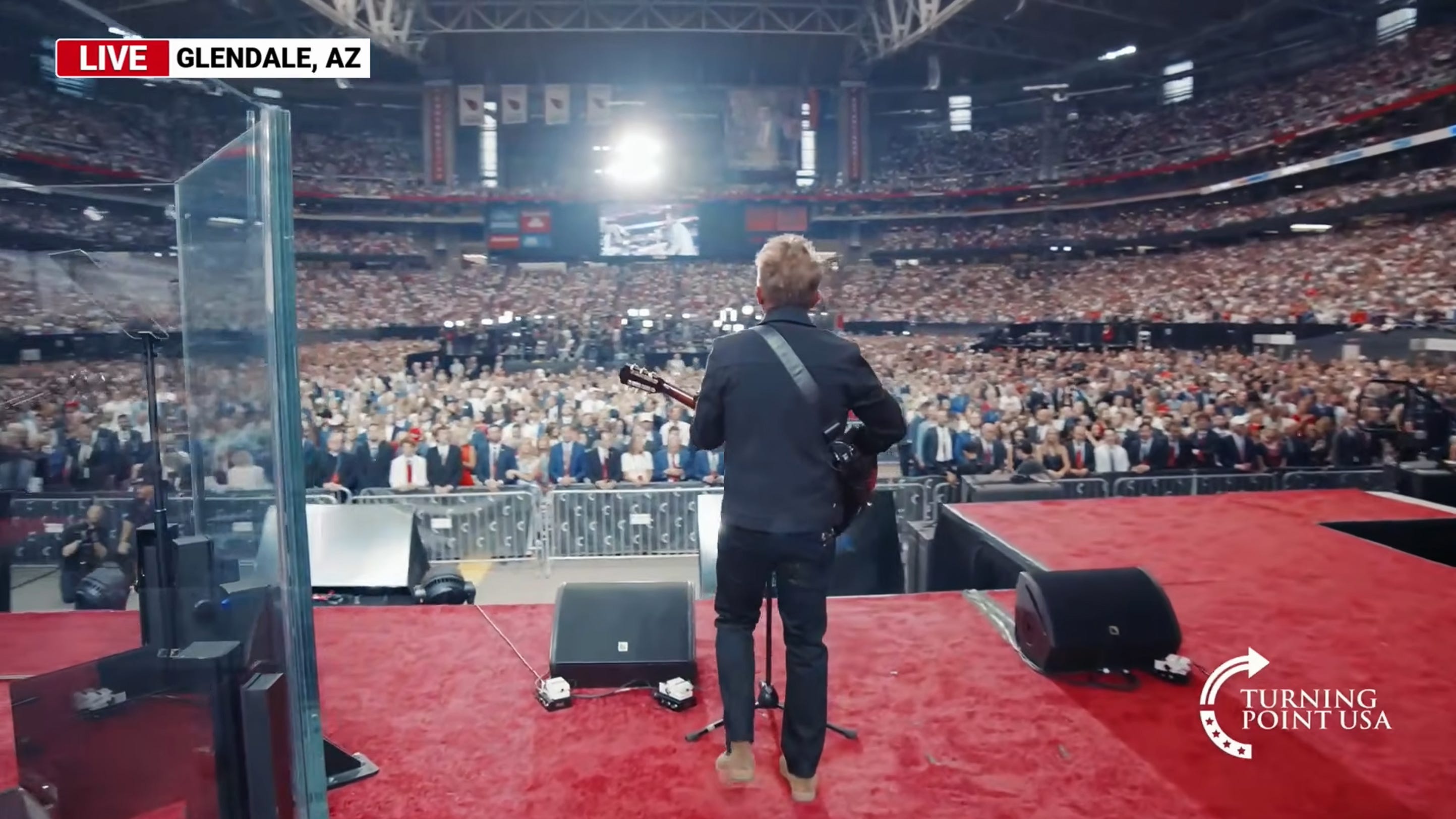 Headlining the singers was Chris Tomlin, one of the biggest worship artists today and whose songs are sung in thousands of churches every Sunday. Other worship singers and songwriters on stage included Phil Wickham, Brandon Lake, Kari Jobe Carnes, and Cody Carnes. Their two hours of songs before the official start of the memorial served to frame everything that followed as part of a church worship service. And their songs intermixed with the various political speakers during the five-hour service kept sending the message that Kirk’s politics were from God.