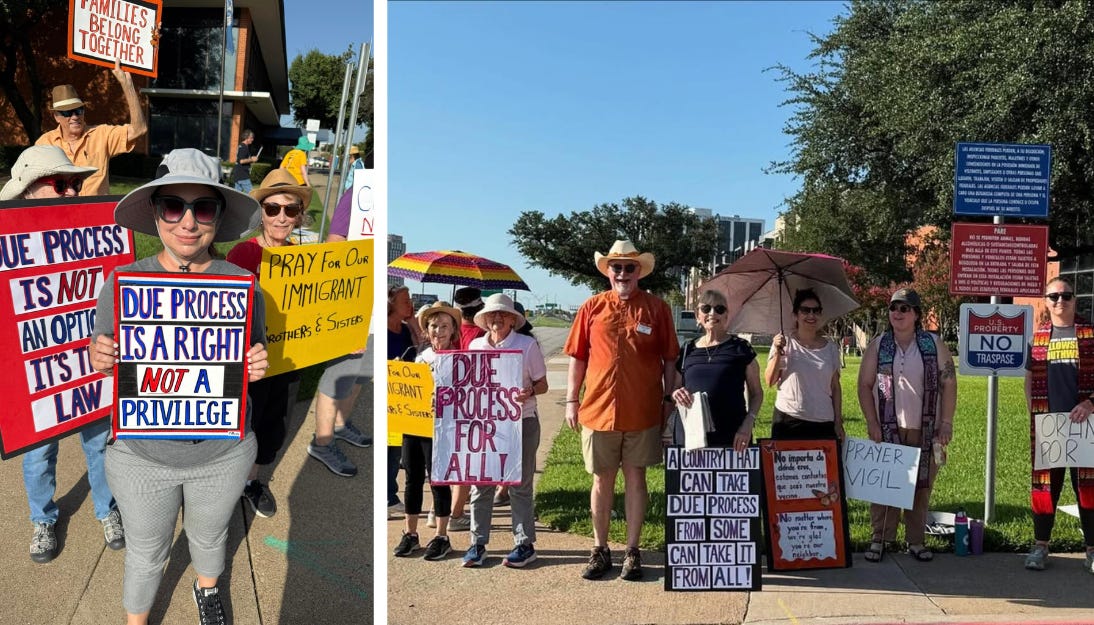 Bim explained that the weekly vigils started after two immigrants from Venezuela in the Dallas-Fort Worth area with no criminal record were grabbed by ICE and sent to a prison in El Salvador. She said that action “brought it home” since it was happening “here in our own community.” An interfaith group of clergy and other faith leaders got together, Bim added, and decided, “We have to do something.”