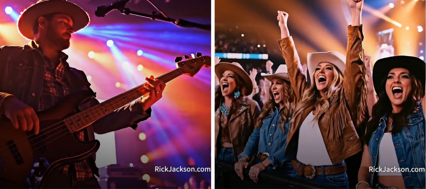 “I found a quiet refuge when the church choir started to sing. I took the punches, took the scars. Kept my eyes on who you are. When the world says stay down, you get up and stand your ground. I’ll fight the tough fights, win big for Georgia,” the AI band sings (with a bunch of AI young women fans singing along as if the song is really famous).
