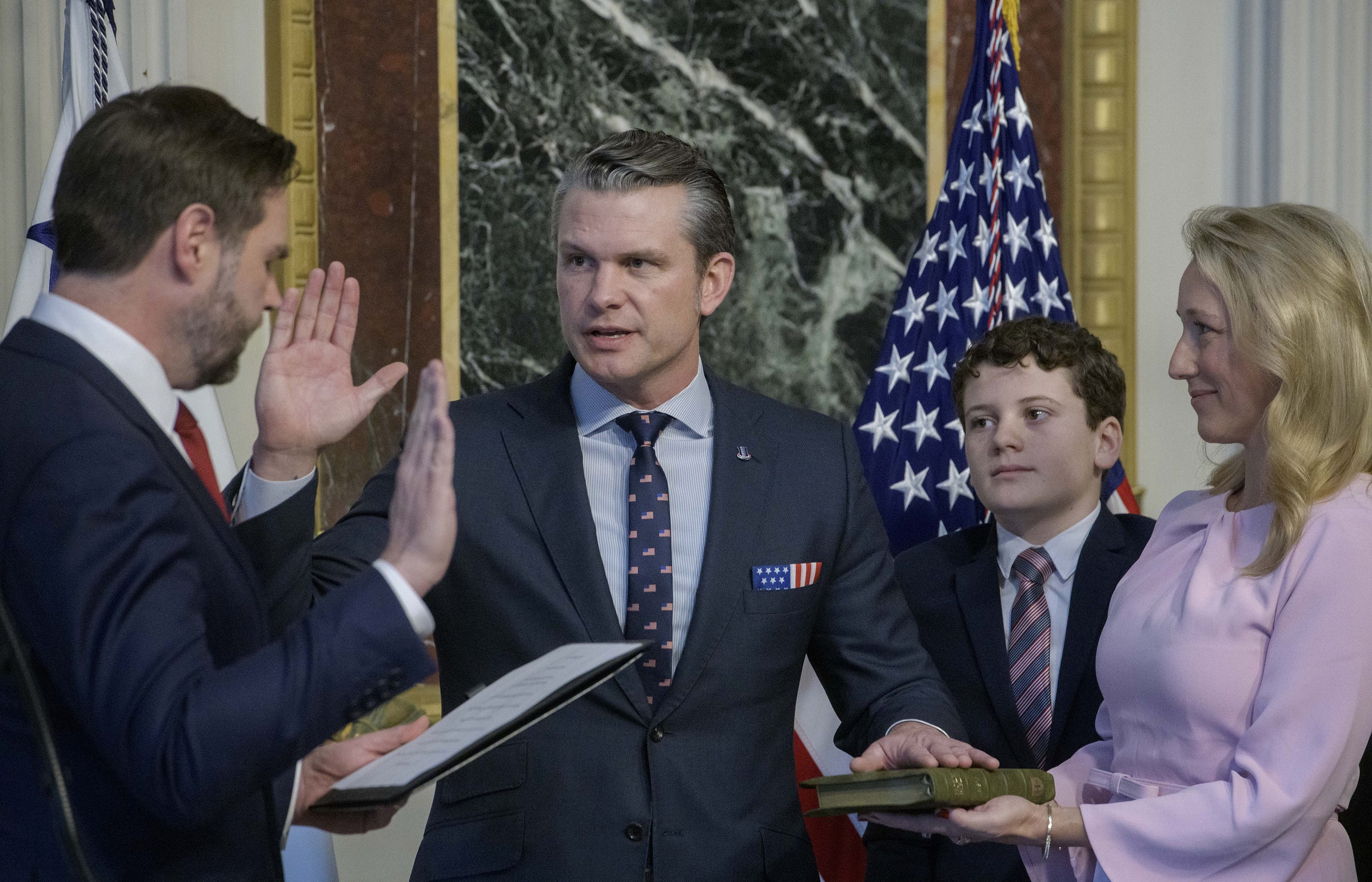 When he was sworn in as the 29th secretary of defense by Vice President J.D. Vance on Jan. 25, 2025, Hegseth raised his right hand and placed his left hand on his olive green Bible. As he swore to “support and defend the Constitution,” his fingers rested on a Jerusalem Cross stamped into the leather of the front cover of the Bible. That same symbol, a large cross with four smaller crosses in the quadrants, is also tattooed on the right side of Hegseth’s chest.