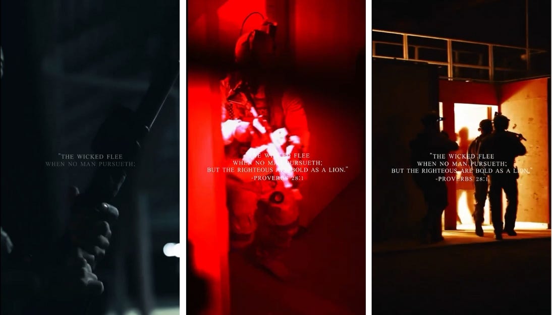 Additionally, a Bible verse (in the King James translation) slowly appears on screen and then stays on for the rest of the video as agents run around pointing guns at empty spaces: “‘The wicked flee when no man pursueth; but the righteous are bold as a lion.’ -Proverbs 28:1”
