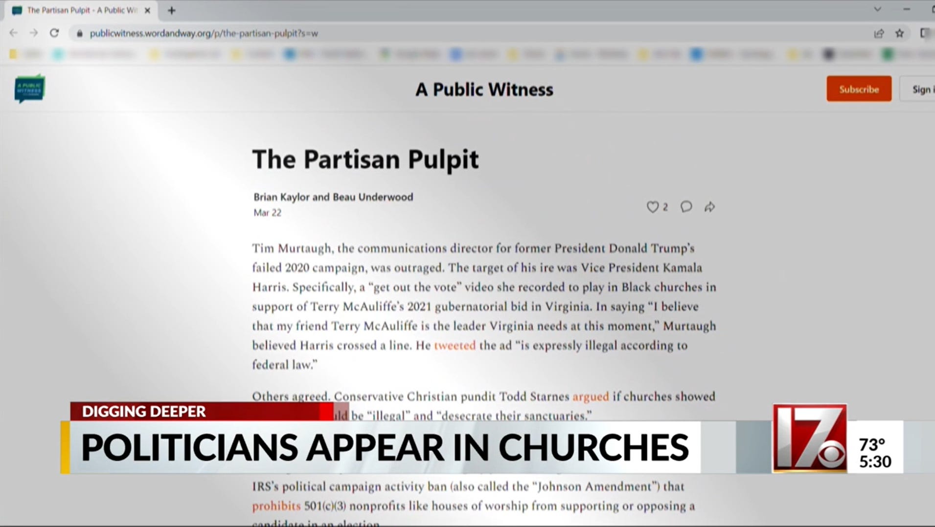 All this caught the attention of WNCN, the CBS affiliate in Raleigh, North Carolina. The station ran a report Tuesday night featuring comments from both the former congressman and Brian, as well as a nice screenshot of A Public Witness (which we’re sending to our parents to show we’re famous).